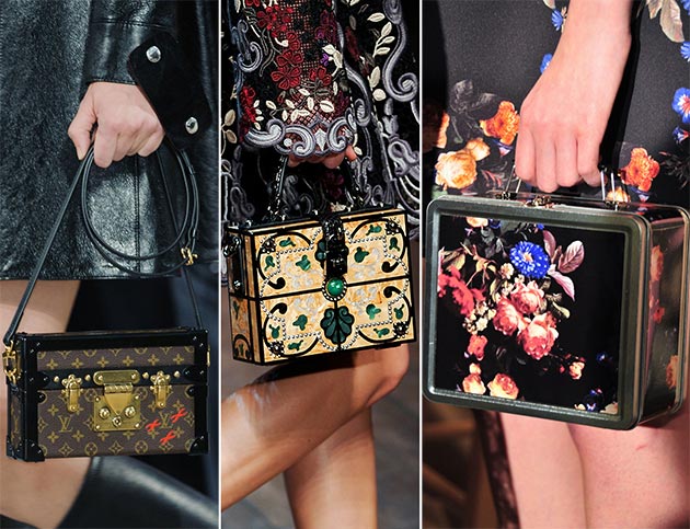 Formele ghiozdan sunt de asemenea prezente la majoritatea aspectelor, venind ca aspectul cheie la case de moda precum Bottega Veneta, Christian Dior, Giambattista Valli, și Rodarte. Interpretările, cum ar fi indicii de piele de reptile, variantele imprimate și tricotaje sunt toate prezente aici.